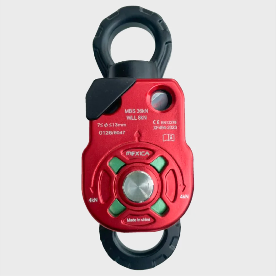 Sus placas móviles con pin, permiten su apertura, aún fijada al anclaje. Además su destorcedor integrado permite orientar la polea bajo carga y conectar directamente diferentes dispositivos.